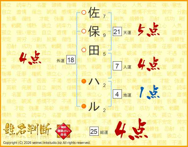 佐保田ハルさんの総運は25画の4点!