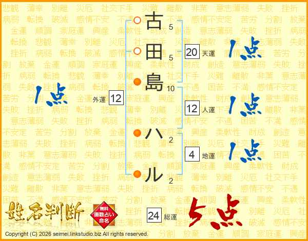 古田島ハルさんの総運は24画の5点!