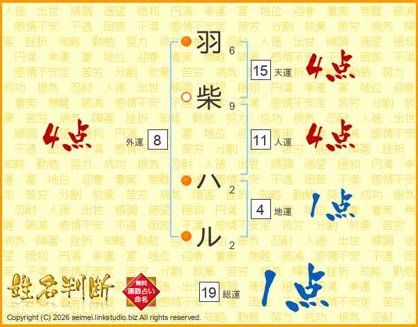 羽柴ハルさんの総運は19画の1点!