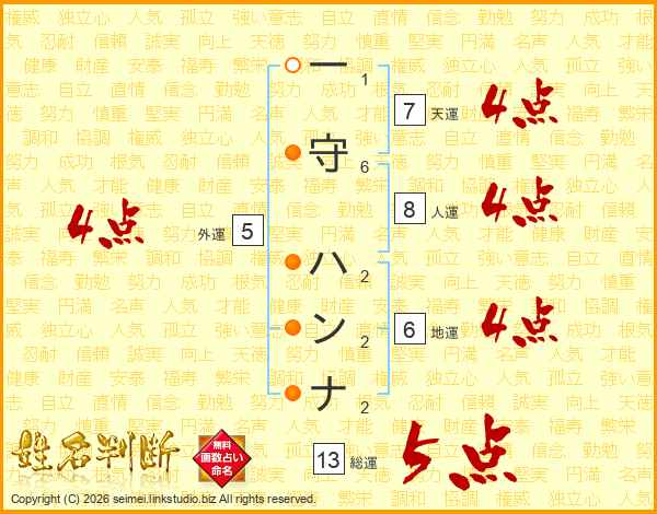 一(1画)守(6画) ハ(2画)ン(2画)ナ(2画)