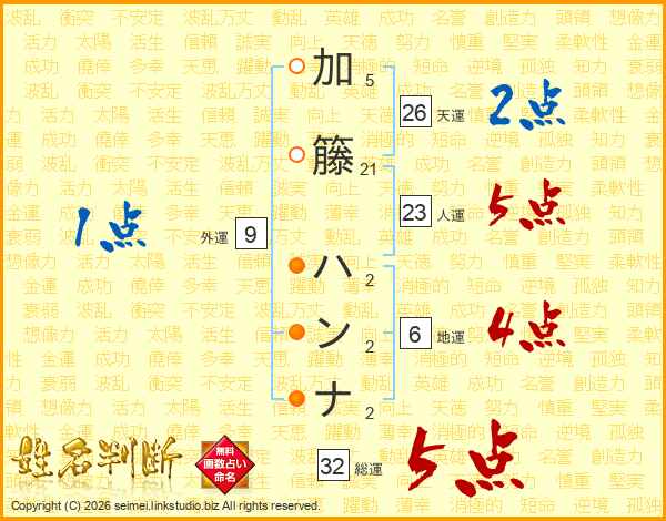加籐ハンナさんの総運は32画の5点!