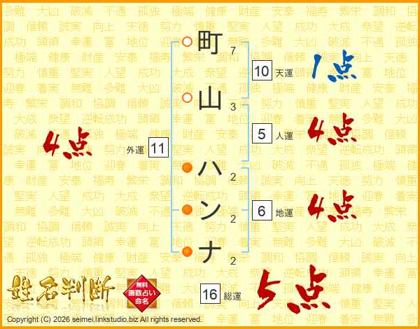 町(7画)山(3画) ハ(2画)ン(2画)ナ(2画)