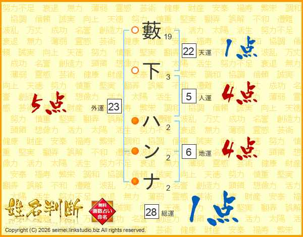 生活面を象徴する運勢です。外部から受ける影響力を表し、結婚運、家庭運や職場、環境への順応性を表します。総運から人運を引いた画数。姓や名が1文字の場合を除く。