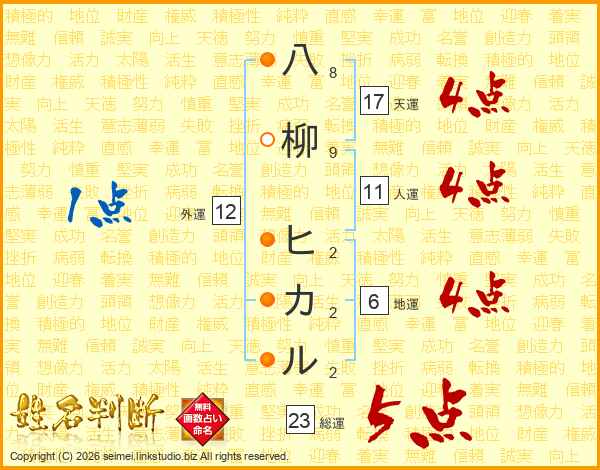 八(8画)柳(9画) ヒ(2画)カ(2画)ル(2画)