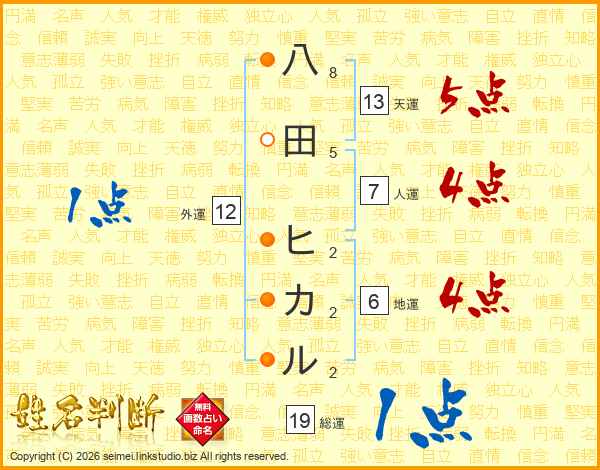 生活面を象徴する運勢です。外部から受ける影響力を表し、結婚運、家庭運や職場、環境への順応性を表します。総運から人運を引いた画数。姓や名が1文字の場合を除く。