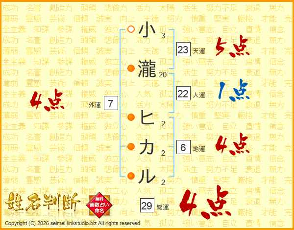 小(3画)瀧(20画) ヒ(2画)カ(2画)ル(2画)