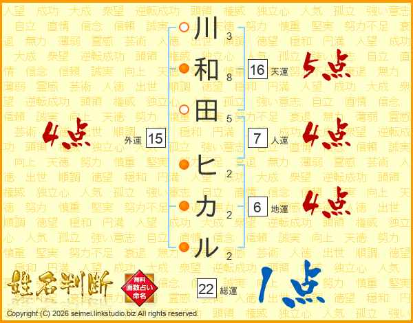 生活面を象徴する運勢です。外部から受ける影響力を表し、結婚運、家庭運や職場、環境への順応性を表します。総運から人運を引いた画数。姓や名が1文字の場合を除く。
