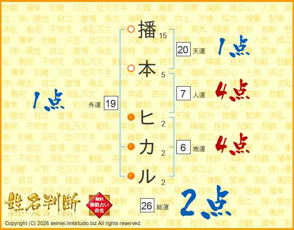 生活面を象徴する運勢です。外部から受ける影響力を表し、結婚運、家庭運や職場、環境への順応性を表します。総運から人運を引いた画数。姓や名が1文字の場合を除く。