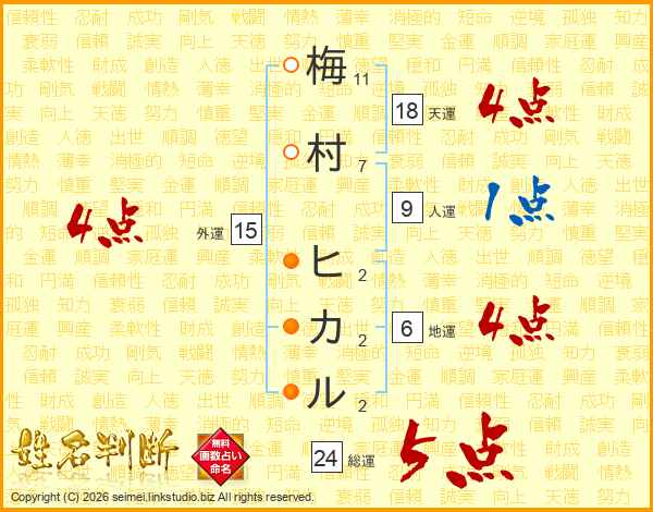梅村ヒカルさんの総運は24画の5点!