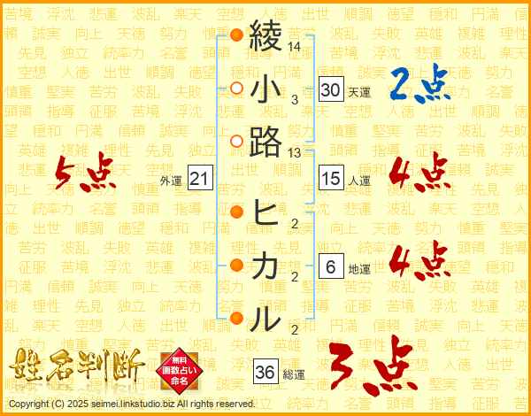 綾小路ヒカルさんの総運は36画の3点!