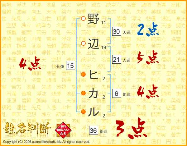 生活面を象徴する運勢です。外部から受ける影響力を表し、結婚運、家庭運や職場、環境への順応性を表します。総運から人運を引いた画数。姓や名が1文字の場合を除く。