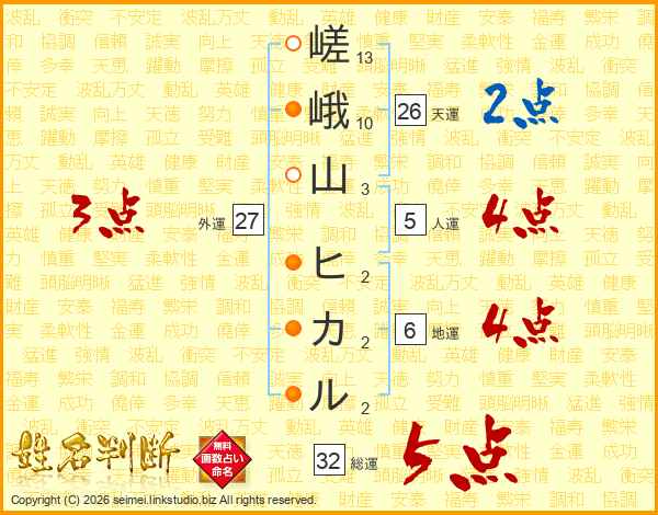 嵯峨山ヒカルさんの天運は26画の2点!