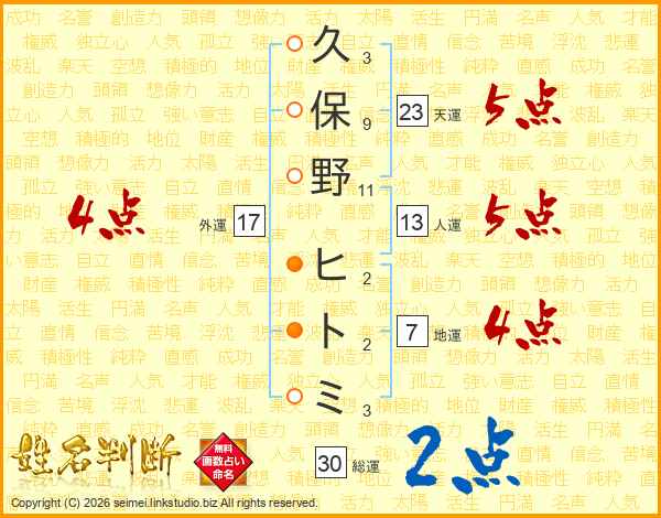 久(3画)保(9画)野(11画) ヒ(2画)ト(2画)ミ(3画)