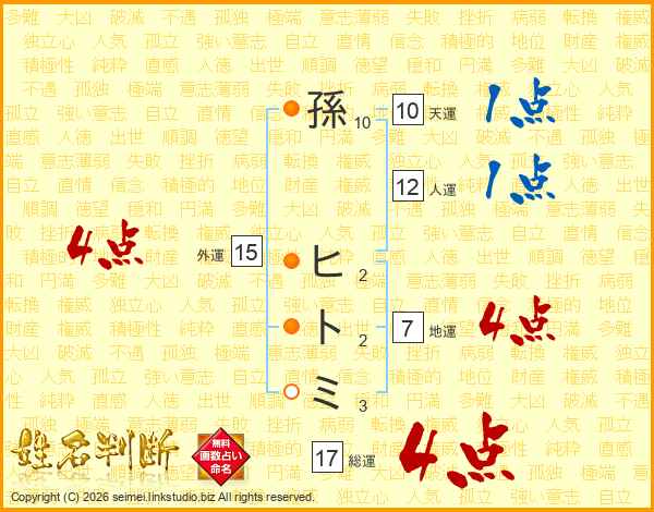孫(10画) ヒ(2画)ト(2画)ミ(3画)