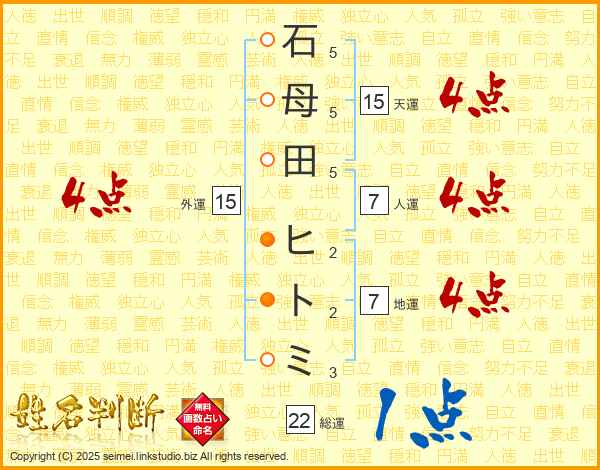 石(5画)母(5画)田(5画) ヒ(2画)ト(2画)ミ(3画)