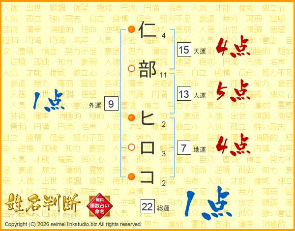 仁部ヒロコさんの総運は22画の1点!