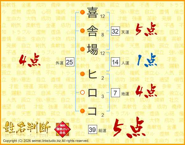 喜(12画)舎(8画)場(12画) ヒ(2画)ロ(3画)コ(2画)