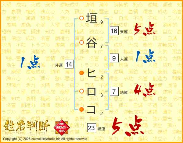 垣谷ヒロコさんの総運は23画の5点!