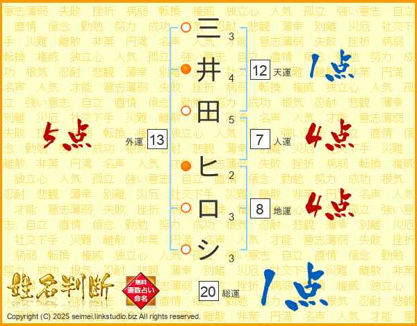 生活面を象徴する運勢です。外部から受ける影響力を表し、結婚運、家庭運や職場、環境への順応性を表します。総運から人運を引いた画数。姓や名が1文字の場合を除く。