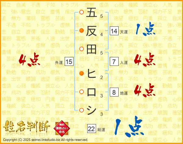 生活面を象徴する運勢です。外部から受ける影響力を表し、結婚運、家庭運や職場、環境への順応性を表します。総運から人運を引いた画数。姓や名が1文字の場合を除く。