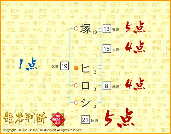 生活面を象徴する運勢です。外部から受ける影響力を表し、結婚運、家庭運や職場、環境への順応性を表します。総運から人運を引いた画数。姓や名が1文字の場合を除く。