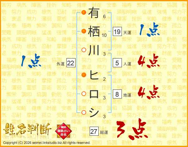 生活面を象徴する運勢です。外部から受ける影響力を表し、結婚運、家庭運や職場、環境への順応性を表します。総運から人運を引いた画数。姓や名が1文字の場合を除く。