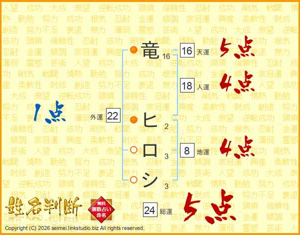 竜ヒロシさんの天運は16画の5点!