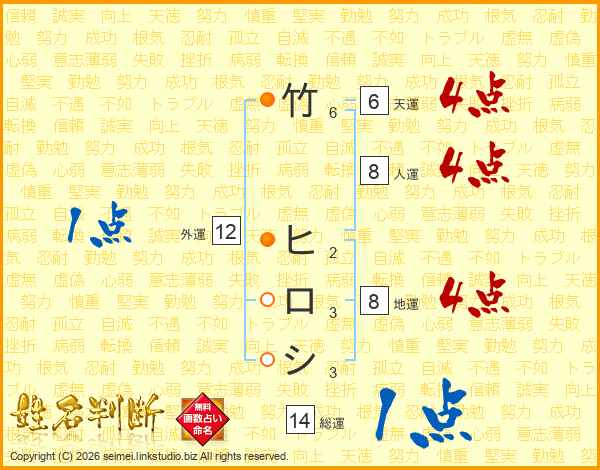 生活面を象徴する運勢です。外部から受ける影響力を表し、結婚運、家庭運や職場、環境への順応性を表します。総運から人運を引いた画数。姓や名が1文字の場合を除く。