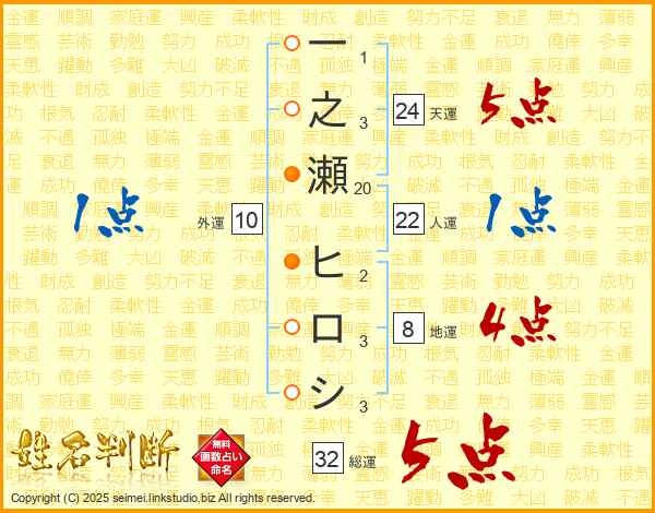 あなたの人生を表す1番重要な運勢です。生涯を通じて影響する総合運となり、主に50歳以降の晩年期に影響を及ぼします。苗字と名前の合計画数。