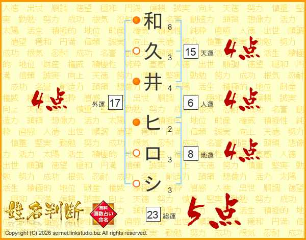 生活面を象徴する運勢です。外部から受ける影響力を表し、結婚運、家庭運や職場、環境への順応性を表します。総運から人運を引いた画数。姓や名が1文字の場合を除く。