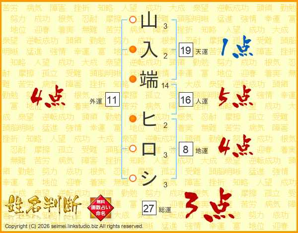 山(3画)入(2画)端(14画) ヒ(2画)ロ(3画)シ(3画)