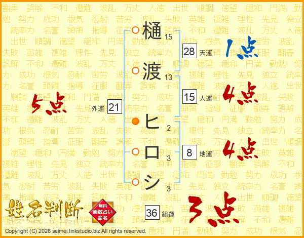 あなたの人生を表す1番重要な運勢です。生涯を通じて影響する総合運となり、主に50歳以降の晩年期に影響を及ぼします。苗字と名前の合計画数。