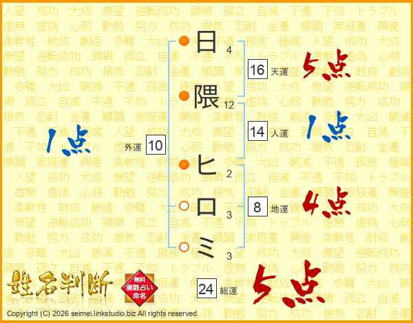 画数の奇数(○陽)と偶数(●陰)の配列で吉凶を占います。どちらかにかたよる名前は大凶名で避ける必要があります。画数の奇数偶数。