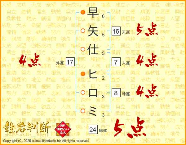 生活面を象徴する運勢です。外部から受ける影響力を表し、結婚運、家庭運や職場、環境への順応性を表します。総運から人運を引いた画数。姓や名が1文字の場合を除く。
