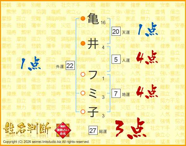 亀(16画)井(4画) フ(1画)ミ(3画)子(3画)