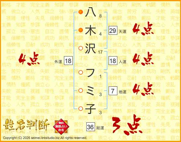 八(8画)木(4画)沢(17画) フ(1画)ミ(3画)子(3画)