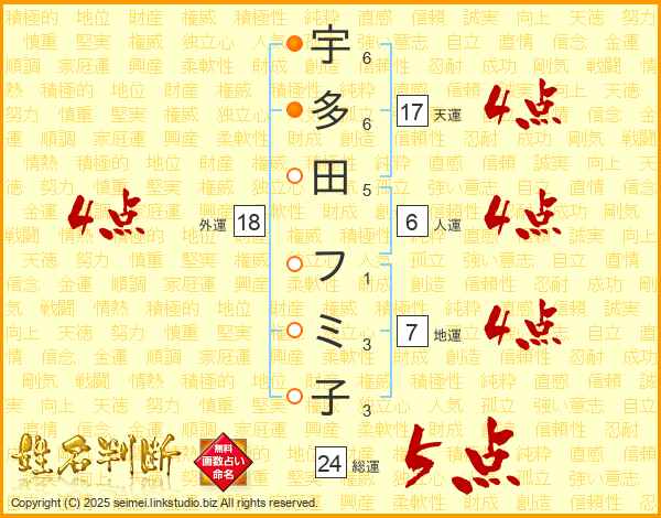 宇多田フミ子さんの外運は18画の4点!