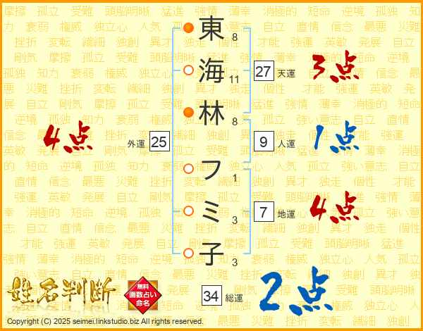 東(8画)海(11画)林(8画) フ(1画)ミ(3画)子(3画)
