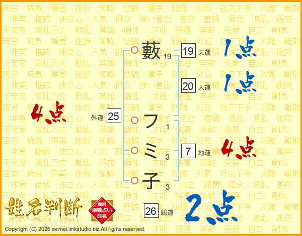 生活面を象徴する運勢です。外部から受ける影響力を表し、結婚運、家庭運や職場、環境への順応性を表します。総運から人運を引いた画数。姓や名が1文字の場合を除く。