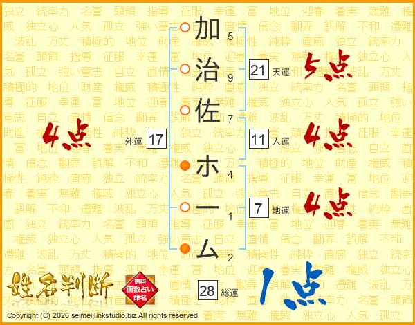 加(5画)治(9画)佐(7画) ホ(4画)ー(1画)ム(2画)