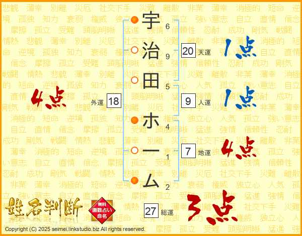 宇(6画)治(9画)田(5画) ホ(4画)ー(1画)ム(2画)