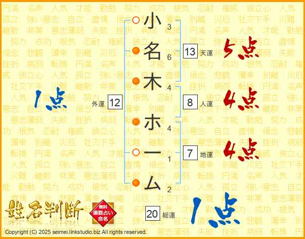 小(3画)名(6画)木(4画) ホ(4画)ー(1画)ム(2画)