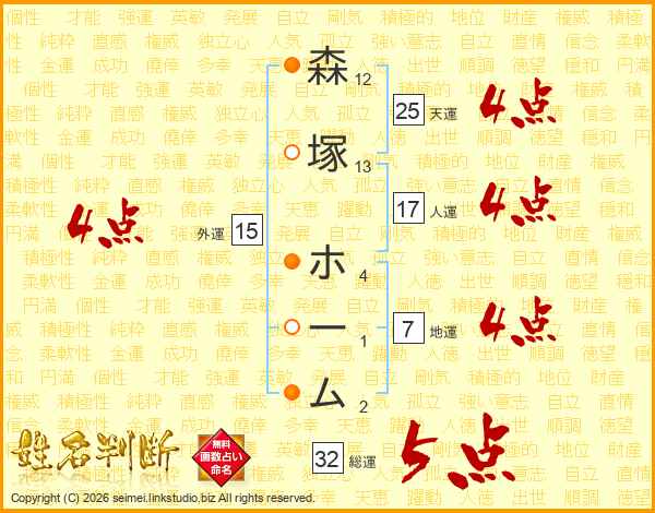 森(12画)塚(13画) ホ(4画)ー(1画)ム(2画)
