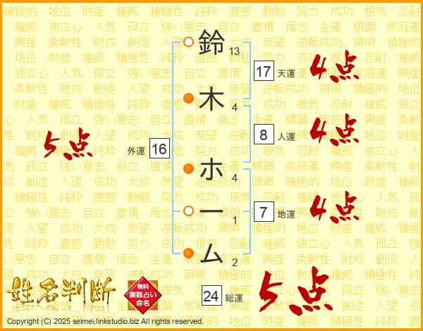 鈴(13画)木(4画) ホ(4画)ー(1画)ム(2画)