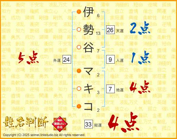 伊(6画)勢(13画)谷(7画) マ(2画)キ(3画)コ(2画)