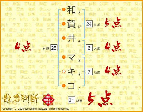 和(8画)賀(12画)井(4画) マ(2画)キ(3画)コ(2画)