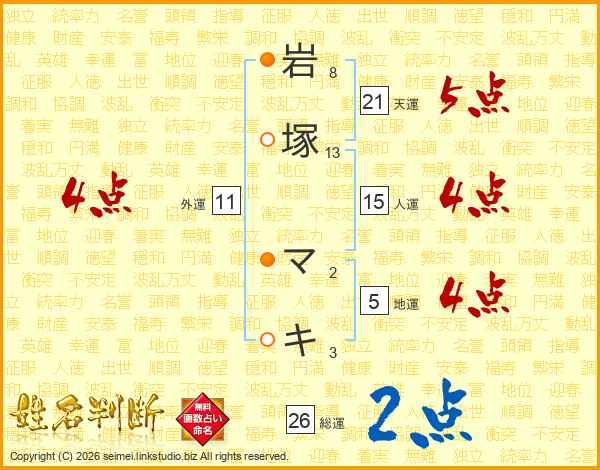 岩(8画)塚(13画) マ(2画)キ(3画)