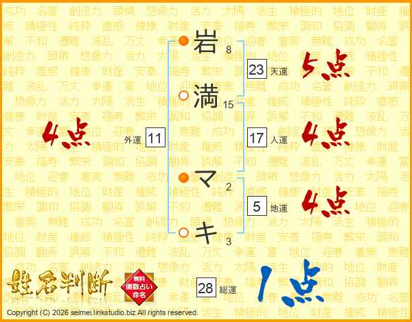 岩(8画)満(15画) マ(2画)キ(3画)