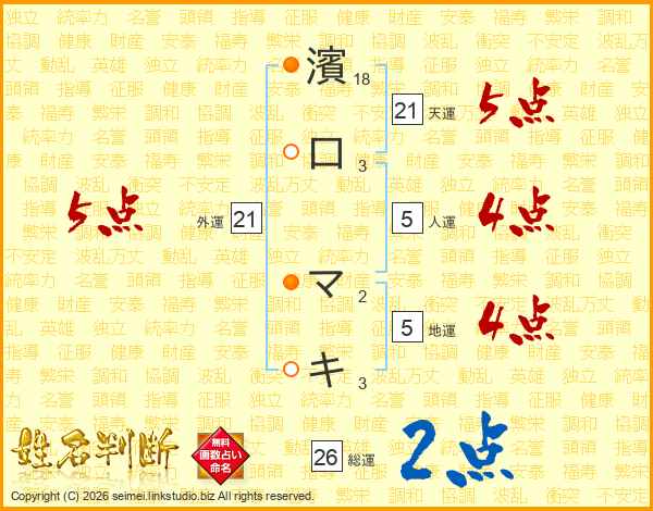 あなたの人生を表す1番重要な運勢です。生涯を通じて影響する総合運となり、主に50歳以降の晩年期に影響を及ぼします。苗字と名前の合計画数。