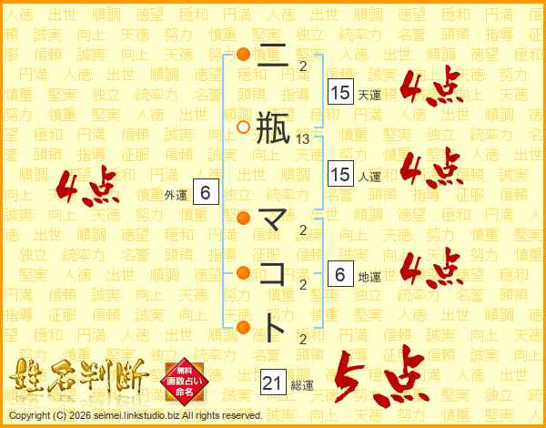 生活面を象徴する運勢です。外部から受ける影響力を表し、結婚運、家庭運や職場、環境への順応性を表します。総運から人運を引いた画数。姓や名が1文字の場合を除く。
